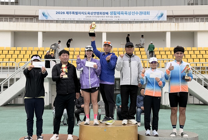 2026제주자치도육상연맹회장배 전도 마스터즈 육상선수권대회 종합 1위에 오른 달리기제주인클럽(가운데). 제주특별자치도육상연맹 제공