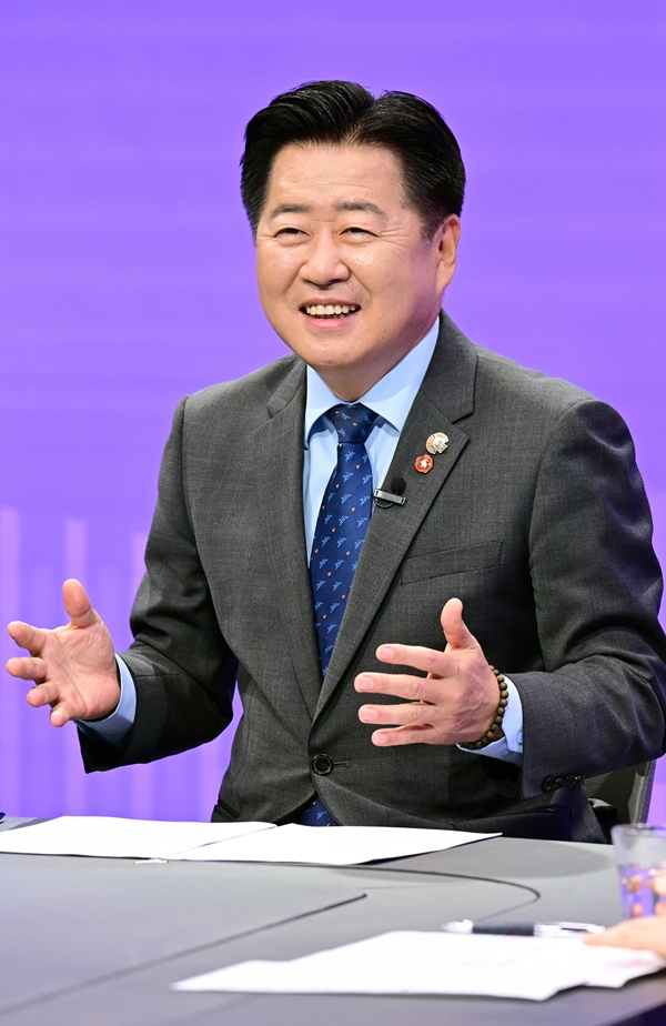 제주도지사 재선에 도전하는 오영훈 제주지사가 24일 KCTV 제주방송 스튜디오에서 열린 '제주도지사 선거 예비주자 특별대담'에 참석하고 있다. 특별대담은 한라일보와 KCTV제주방송, 삼다일보, 헤드라인제주가 공동 주최했다. 강희만 기자