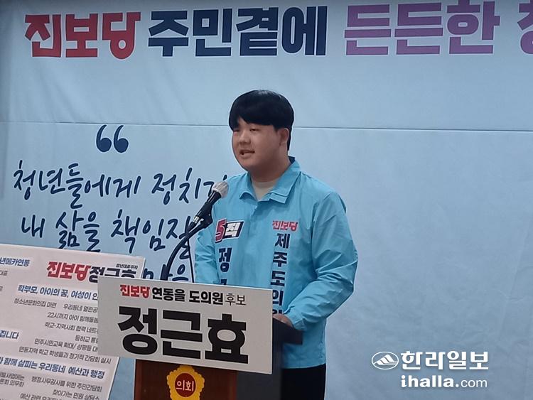 25일 제주도의회 도민카페에서 기자회견을 연 정근효 예비후보. 오소범 기자