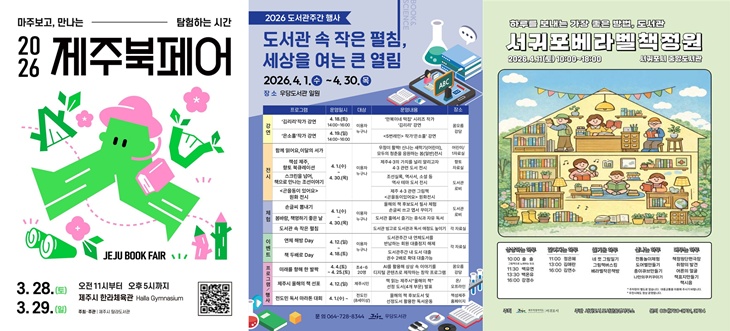왼쪽부터 제주북페어 2026, 우당도서관 도서관 주간 행사, 2026 서귀포베라벨책정원. 각 도서관 제공