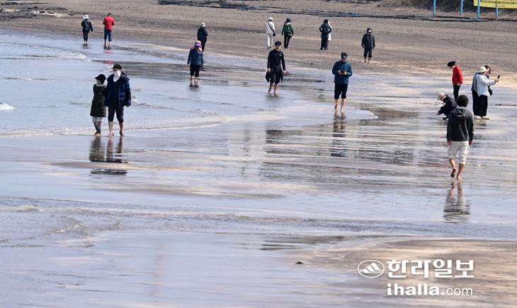 맨발로 해변 걷는 시민들