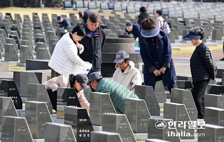 표석 정비하는 4·3유족들