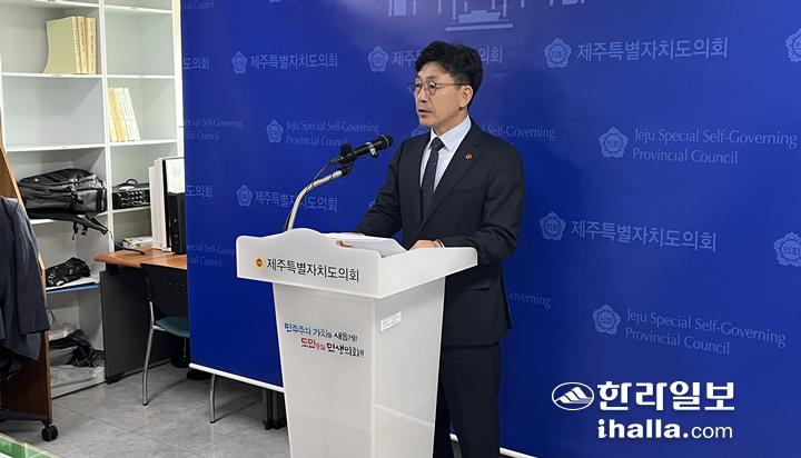 강상수 제주도의원이 30일 제주도의회 기자실에서 기자회견을 열고 있다.