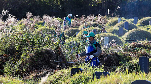 새마을지도자 제주시협의회가 제주시 어승생 공설묘지에서 벌초가 이뤄지지 않은 분묘에 대해 벌초 봉사활동을 벌이고 있다. 한라일보DB