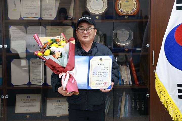 인명구조 유공자 제237해덕호 선장 장정길(53)씨가 제주해경으로부터 해양경찰청장 감사장을 받았다. 제주지방해양경찰청 제공