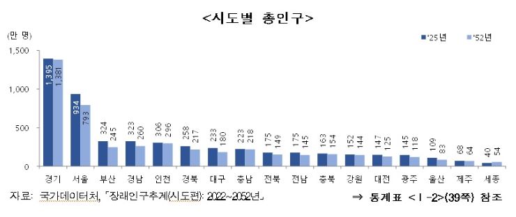 전국적으로는 2052년에 세종(40만명→54만명)을 제외한 모든 시도의 총인구가 올해보다 감소할 것으로 전망됐다.