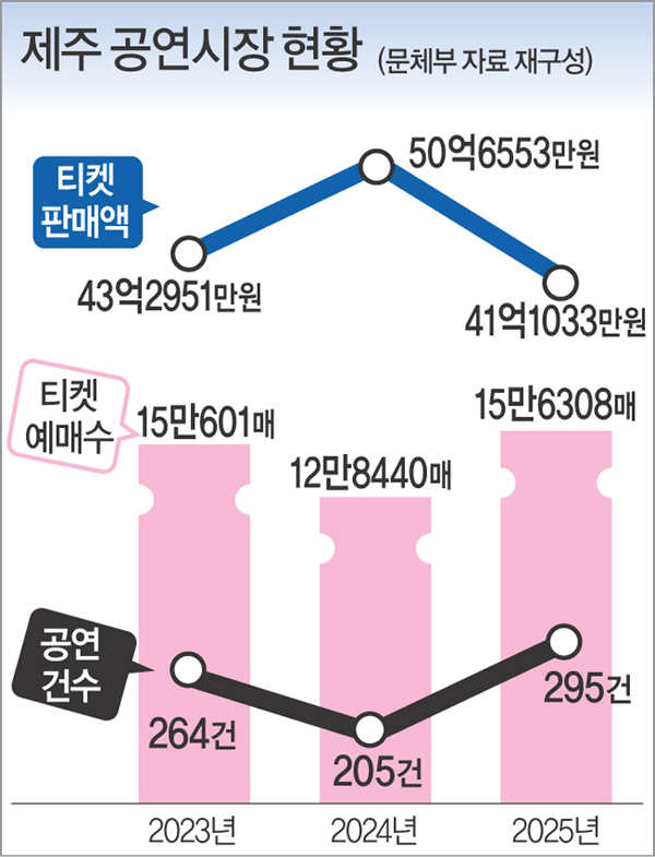 제주 지역은 2025년 공연 건수(295건)와 공연 회차(1972회) 모두 전년(205건, 1700회)과 비교해 증가했고 티켓 예매 수도 15만6308매로 전년(12만8440매)보다 늘었다. 반면 티켓 판매액은 41억1033만 원으로 전년(50억6553만 원)보다 줄었다. 보고서는 일부 광역 시도에서 티켓 판매액이 티켓 예매 수 대비 더 큰 폭으로 감소한 것을 두고 "무료 또는 저렴한 공연이 더 많았을 것으로 유추된다"고 했는데 제주 지역도 그런 영향으로 추정된다.