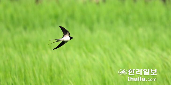 [한라일보] 봄을 맞아 돌아온 제비가 31일 제주시 한경면 고산리 청보리밭 위를 날아다니고 있다.