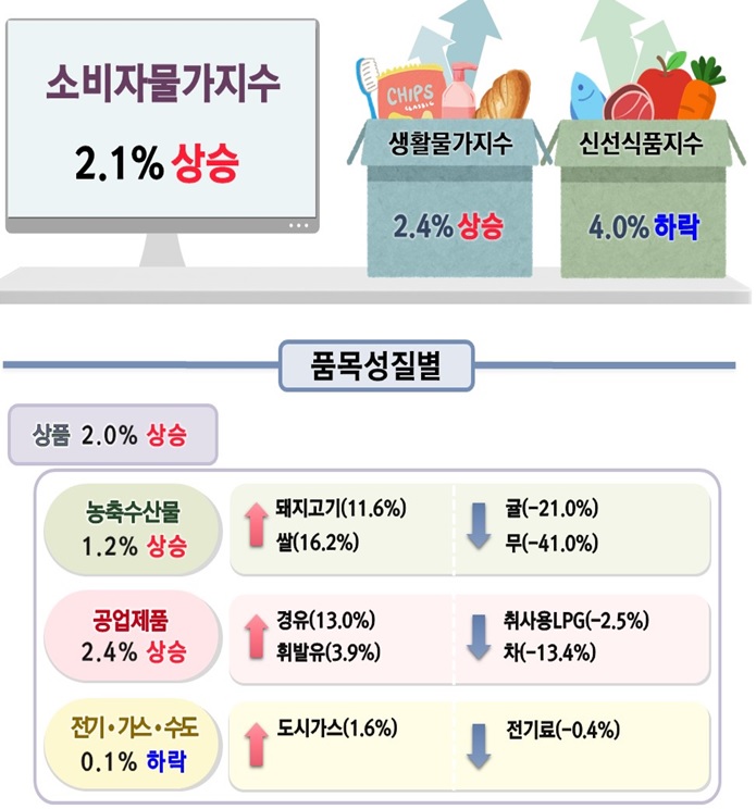 농축수산물 가격은 1.2% 올라 상대적으로 오름폭이 낮았다. 돼지고기가 11.5% 올랐고, 쌀값 16.2%, 고등어는 25.8% 상승했다. 무(-41.0%), 당근(-49.6%) 가격은 크게 내렸다.