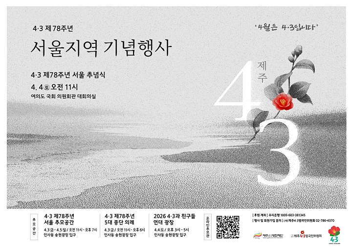 (사)제주4·3범국민위원회는 오는 4일 오전 11시 서울 여의도 국회 의원회관 대회의실에서 ‘4·3 제78주년 서울 추념식’을 개최한다고 2일 밝혔다.