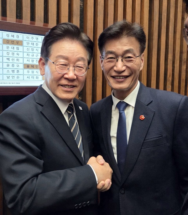 2일 국회에서 열린 추경예산 시정연설 후 이재명 대통령과 악수 나누는 문대림 의원. 문대림 의원실 제공