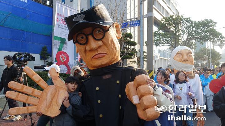 2일 개최된 4·3평화대행진에서 4·3의인 문형순 서장 인형탈을 쓴 참가자가 행진에 참여했다. 양유리기자