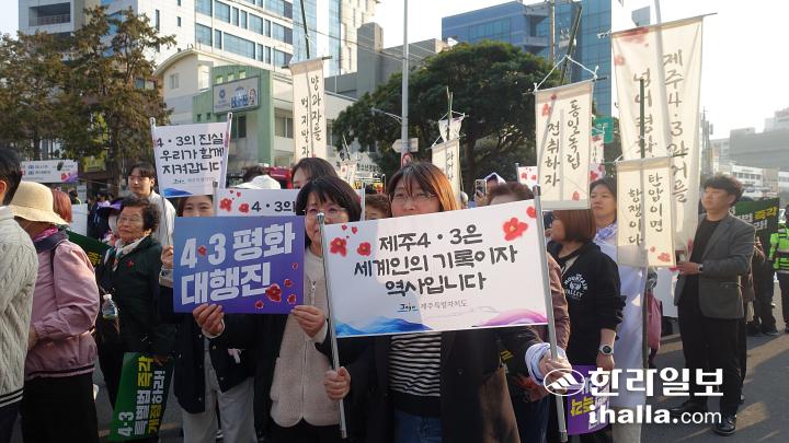 2일 개최된 4·3평화대행진 참가자들이 사진을 찍고 있다. 양유리기자