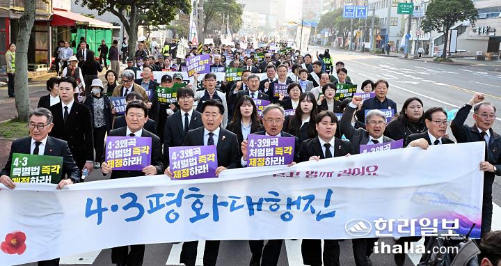 2일 개최된 4·3평화대행진. 전 참가자들이 제주시청 인근에서 모여 제주문예회관으로 향하고 있다. 강희만 기자