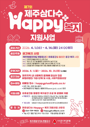 제주특별자치도개발공사(사장 백경훈)가 주최하고 제주사회복지공동모금회(회장 강지언)가 주관하는 '제7회 제주삼다수 Happy+ 복지지원사업'의 일환인 공간복지사업 재공모가 1일부터 진행되고 있다.