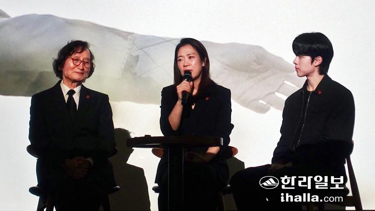 지난 3일 영화 '내 이름은' 제주 시사회에서 정지영 감독과 주연을 맡은 염혜란·신우빈 배우(왼쪽부터)가 관객과의 대화를 하고 있다. 진선희기자
