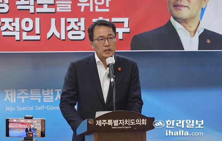 국민의힘 문성유 제주도지사 후보가 7일 제주도의회 도민카페에서 기자회견을 열고 있다..