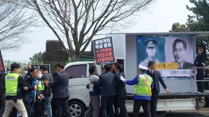 지난 3일 4·3 추념식이 열린 제주4·3평화공원 앞에서 일부 극우 유튜버들과 4·3단체가 동시에 집회를 진행하면서 경찰이 충돌을 막고 있다. 양유리기자