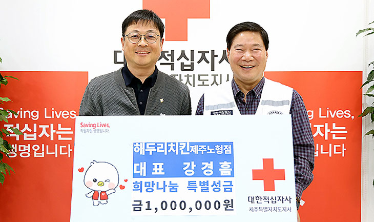 해두리치킨(대표 강경흠)은 최근 대한적십자사 제주도지사(회장 정태근)에 특별성금 100만원을 기탁했다.