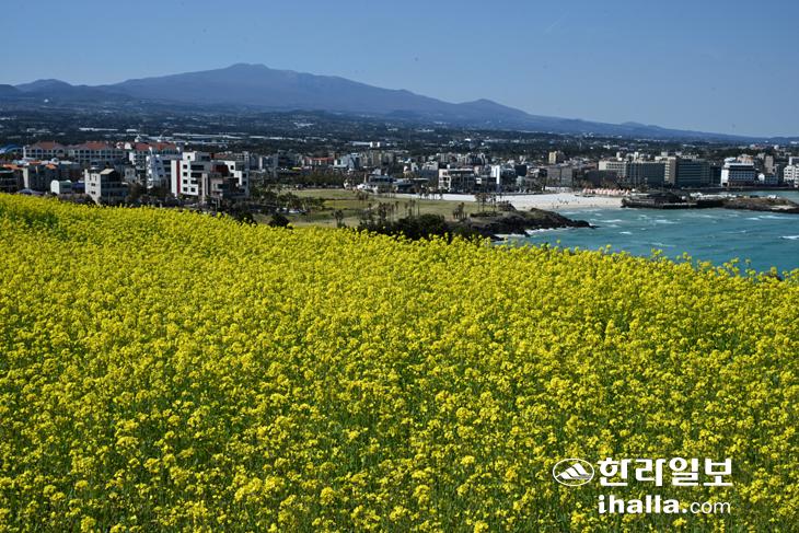 [한라일보] 7일 제주시 조천읍 서우봉에 만개한 유채꽃밭 너머로 한라산이 웅장한 자태를 뽐내고 있다.