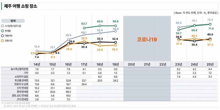 외국인 관광객의 제주여행 쇼핑 장소(중복 응답)는 시내 상점가가 72.4%로 가장 높은 비중을 차지했다. 2015년(12.1%)과 견주면 눈에 띄는 변화다. 면세점 쇼핑은 71.9%로 지속적으로 활용되는 것으로 나타났다. 대형마트 쇼핑은 2015년 9.5%에서 지난해 40.0%로 늘었고, 같은기간 전통시장 쇼핑은 8.3%에서 37.3%로 증가했다.