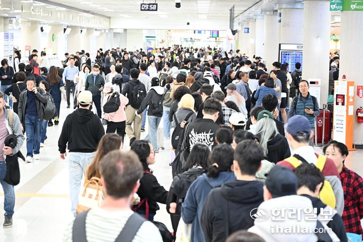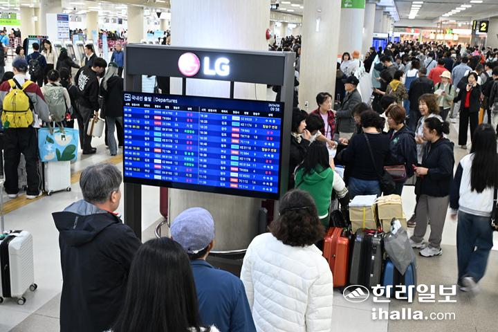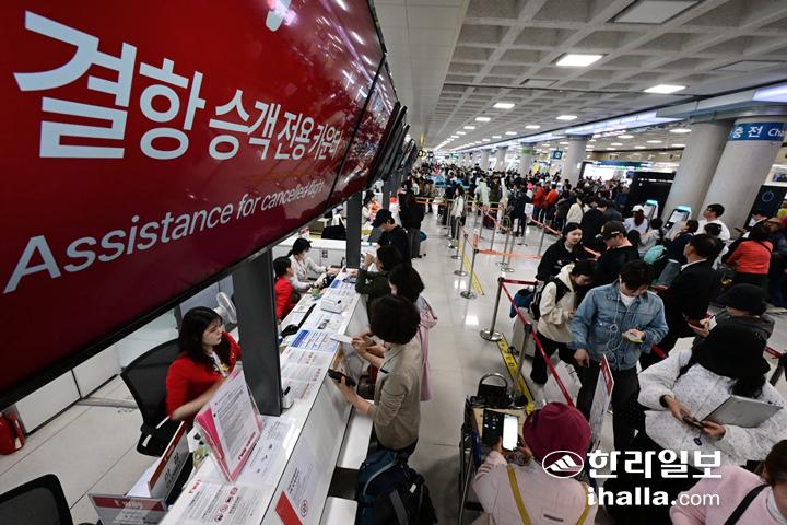 9일 제주공항 급변풍특보와 다른 지방 악기상이 겹치면서 제주기점 항공편 129편이 무더기 결항하면서 제주공항 대합실이 극심한 혼잡을 빚고 있다. 강희만 기자