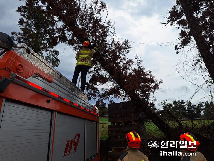 강풍에 쓰러진 나무에 대해 안전조치하고 있는 소방대원. 제주도소방안전본부