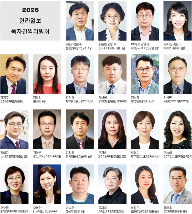 올해 독자권익위 집행부는 지난해와 동일하게 꾸려졌다. 위원장은 김찬수 한라산생태문화연구소장이, 부위원장은 강민숙 전 제주도의회 의원과 문만석 (사)한국지역혁신연구원장이 공동으로 맡는다.