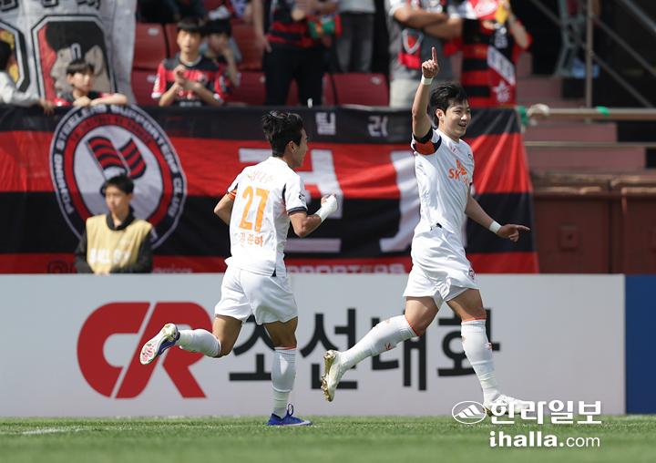 11일 K리그1 포항과의 원정경기에서 시즌 첫골을 넣은 후 환호하는 제주 신상은(오른쪽). 한국프로축구연맹 제공