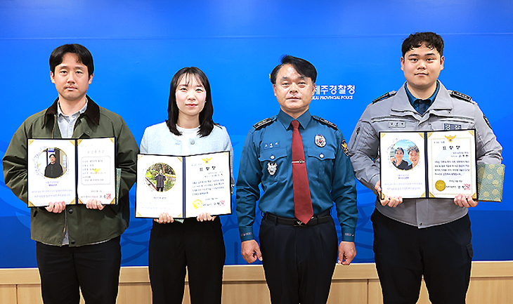왼쪽부터 김성규 경장, 김민지 행정관, 고평기 제주경찰청장, 김종현 경사. 제주경찰청 제공