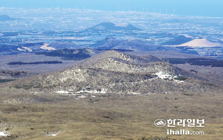 정면에 나란히 있는 3개의 오름이 세성제오름이다. 맨 앞 오름에 보이는 팔각정이 1100도로 탐라각이다. 사진 김찬수