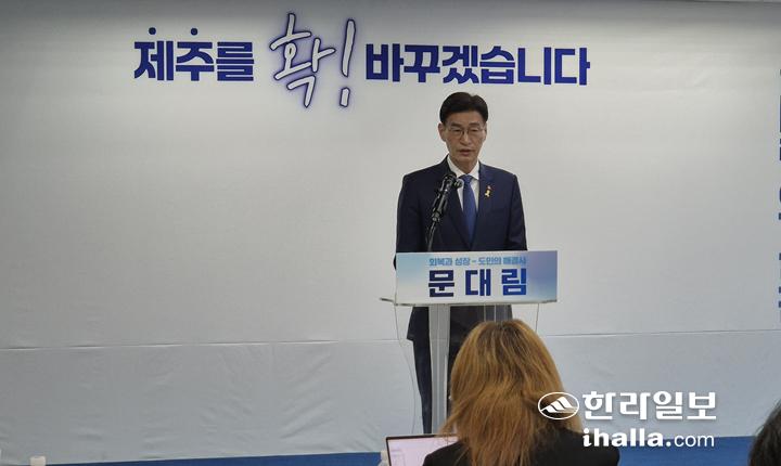 15일 제주시 노향동 선거사무소에서 기자회견을 열고 있는 문대림 후보. 김채현기자