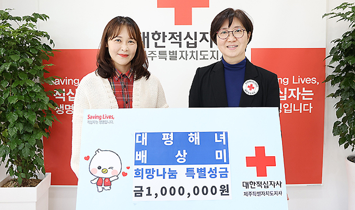 서귀포시 대평리 해녀 배상미 씨는 최근 대한적십자사 제주특별자치도지사(회장 정태근)에 어려운 이웃을 위한 희망나눔 특별성금 100만원을 기탁했다.