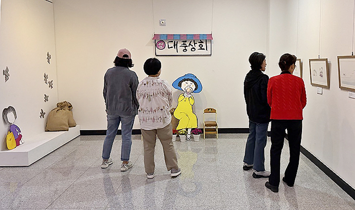 제주그림책연구회의 신작 '대풍상회'는 1970년대 제주시 원도심 산지천 인근을 배경으로 쌀집 가족의 일상과 어린 시절의 기억을 따뜻한 시선으로 담아냈다. 오는 30일까지 이어지는 이번 전시에는 그림책에 수록된 주요 장면의 원화를 선보이고 있다. 그림책 속 캐릭터를 실제 크기로 구현한 포토존도 설치했다.