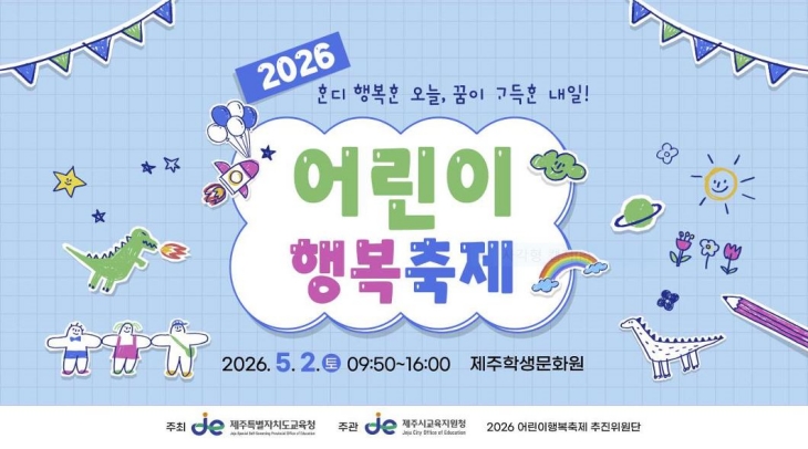 [한라일보] 제주시교육지원청이 어린이날을 기념해 5월 2일 제주학생문화원에서 '2026 어린이 행복 축제'를 연다. 올해 축제 주제는 '함께 행복한 오늘, 꿈이 가득한 내일'로, '오늘의 행복이 반짝이는 내일의 꿈'이 될 거라는 응원을 담았다.