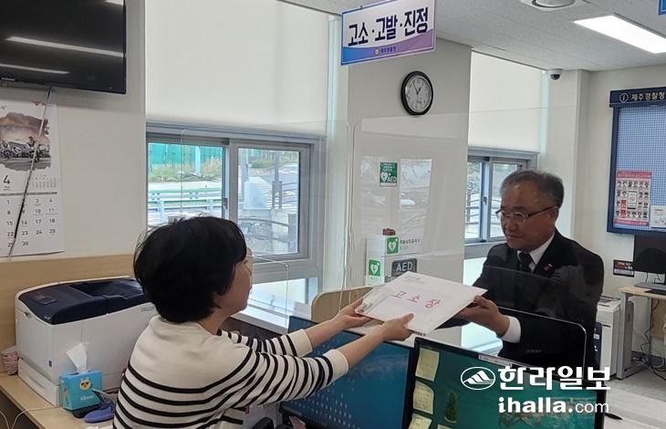 17일 제주경찰청에서 김창범 제주4·3희생자유족회장이 4·3 왜곡 집회와 관련해 고소장을 제출하고 있다. 박소정기자