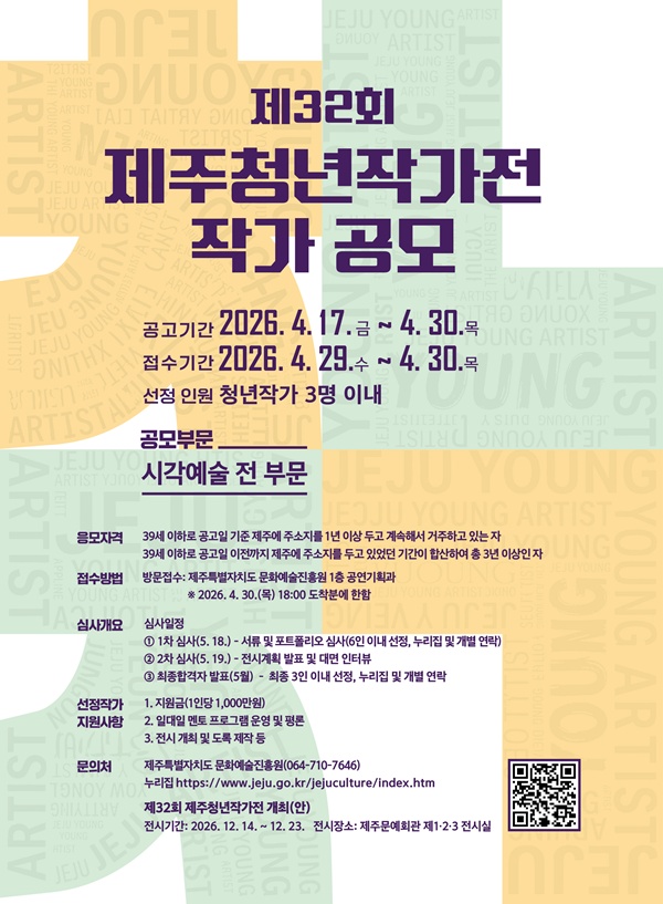 [한라일보] 제주특별자치도 문화예술진흥원이 제32회 제주청년작가전 작가를 공모한다. 청년작가전은 도 문화예술진흥원의 대표 사업 중 하나로 제주 청년 작가의 창작 역량을 발굴하고 지역 미술 문화의 미래를 이끌 인재를 육성하려는 취지로 치러지고 있다.