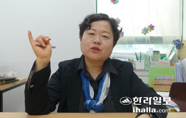 박정경 전국장애인부모연대 제주지부장이 취재진과 인터뷰하고 있다. 양유리기자