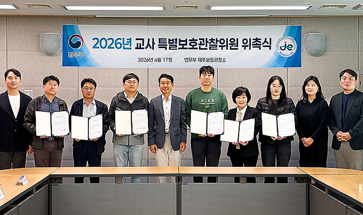 법무부 제주보호관찰소(소장 이맹숙)는 지난 17일 보호관찰 대상 학생들의 원활한 학교 적응을 돕고 재범을 방지하기 위해 2026년 교사 특별보호관찰위원 위촉식을 개최했다. 특별보호관찰위원에는 도내 중·고등학교 교사 7명이 특별보호관찰위원으로 위촉됐다.