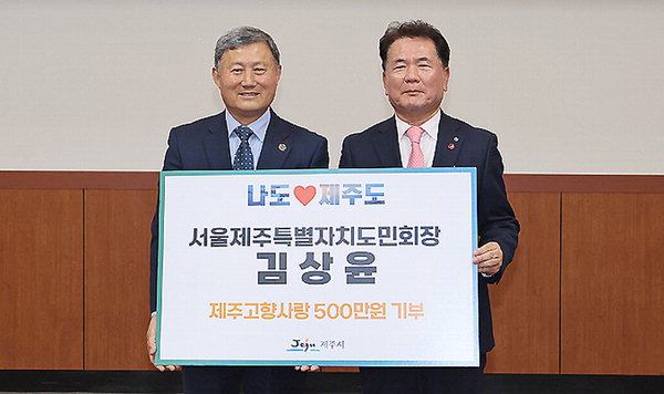[한라일보] 김상윤 제35대 서울제주특별자치도민회장이 지난 16일 제주시청을 방문, 김완근 제주시장 등을 만난 자리에서 고향사랑기부금 500만원을 기탁했다.