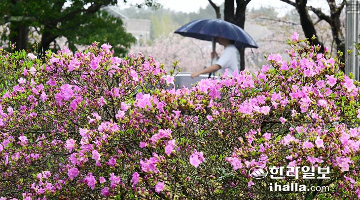 봄비 내리는 캠퍼스와 활짝 핀 진달래. 한라일보DB