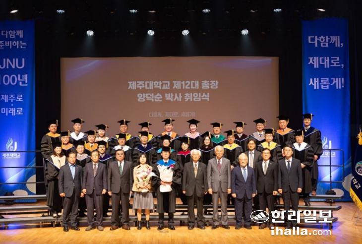 21일 제주대 아라뮤즈홀에서 열린 양덕순 총장 취임식에서 참석자들이 기념 촬영을 하고 있다. 제주대 제공
