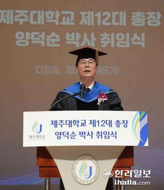 양덕순 총장은 21일 제주대 아라뮤즈홀에서 열린 취임식에서 취임사를 통해 "대학은 지성의 상아탑을 넘어 교육, 연구, 산업, 정주가 하나로 이어지는 '지역 성장의 허브'가 돼야 한다"며 '다함께, 제대로, 새롭게'라는 세 원칙으로 새로운 비전을 실현하겠다고 강조했다.