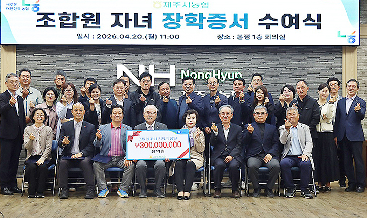 제주시농협(조합장 고봉주)은 지난 20일 본점에서 조합원과 임직원 50여 명이 참석한 가운데 '2026년 제주시농협 조합원 자녀 장학생 장학증서 수여식'을 갖고, 대학생 자녀 300명에게 1인당 100만원의 장학금을 전달했다.