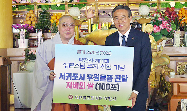 대한불교조계종 약천사(주지 성본스님)는 지난 19일 취약계층을 위한 '자비의 쌀(10㎏)' 100포를 서귀포시에 기탁했다.