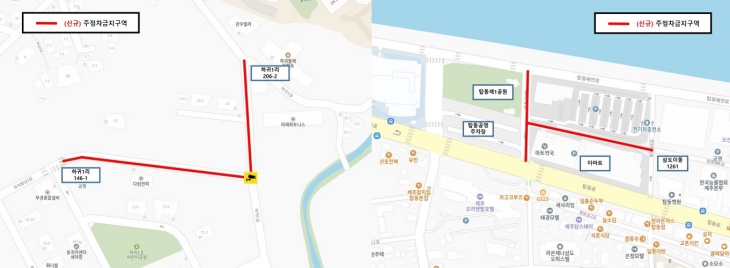 주정차금지구역으로 지정된 미래피트니스 인근(하귀1길, 하귀동남1길사진 왼쪽)과 탑동 이마트 인근(탑동로6길). 제주시 제공