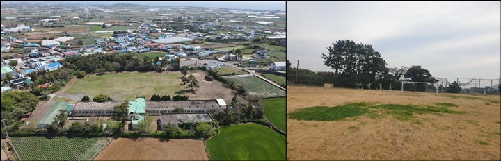 옛 무릉중학교 부지(사진 왼쪽)와 송당리 체육용지. 두 곳 모두 제주도교육청이 소유하고 있다. 한라일보 DB