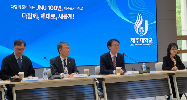 제주대학교 양덕순 총장(왼쪽 세번째)이 23일 제주대 산학협력관에서 열린 취임 기자회견에서 인사말을 하고 있다. 김지은기자