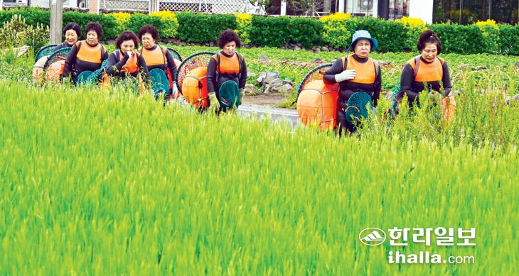 [한라일보] 24일 서귀포시 대정읍 하모리 해녀들이 물질을 하기 위해 청보리 해안도로를 걸어가고 있다.