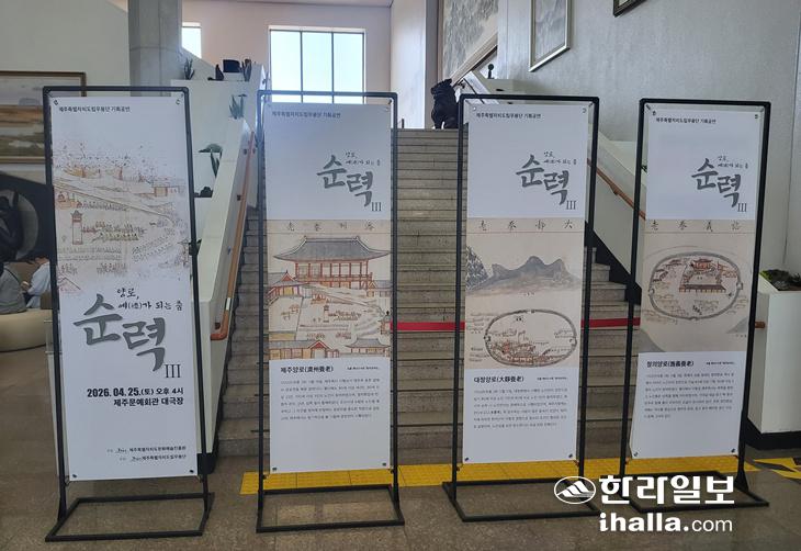 지난 25일 제주도 문예회관 대극장 로비. '순력Ⅲ' 홍보물 등으로 공연장 2층 출입 계단을 막아 놓았다. 진선희기자